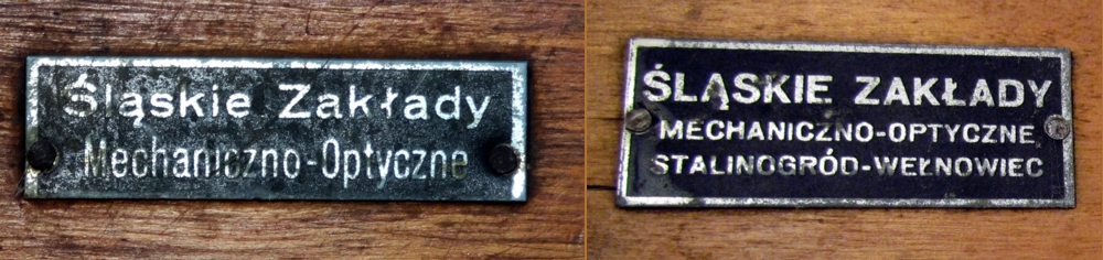 Zakłady Mechaniczno-Optyczne OPTA. Całe tabliczki ze zmienioną nazwą Katowic na Stalinogród świadczą o tym, że powiększalnik był wyprodukowany około 07.03.1953 roku. Przycięte tabliczki znamionują produkcje po 10.12.1956 roku, kiedy to przywrócono nazwę Katowice. |